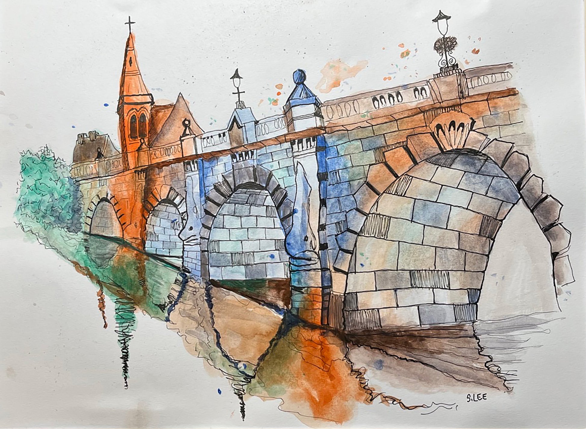 English Bridge is an original watercolor painting on watercolor paper by Florida artist, Sheryl Lee, and is signed by the artist. Overall measures 14" x 11". The painting is a mixed media painting with the use of watercolor and pen and ink. It is matted and ready for framing.